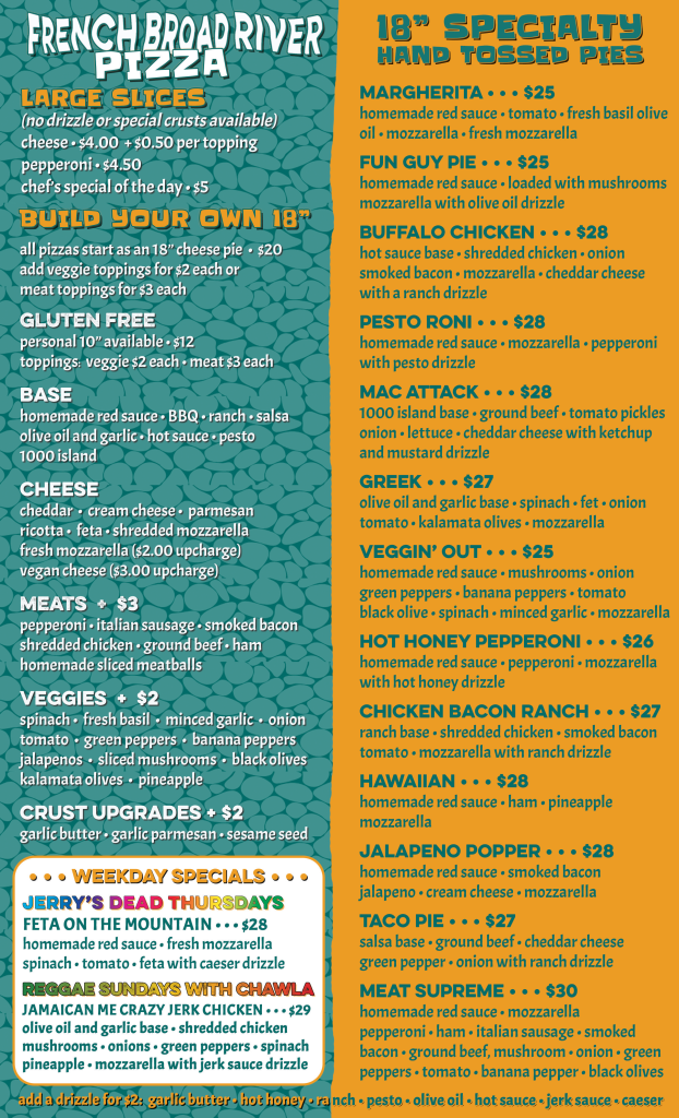At French Broad River Pizza, every pizza is made to order, ensuring that each bite is as satisfying as the last. Whether you crave a classic favorite or want to try one of our unique, inventive creations, our menu has something for every palate. We offer pizza by the slice!