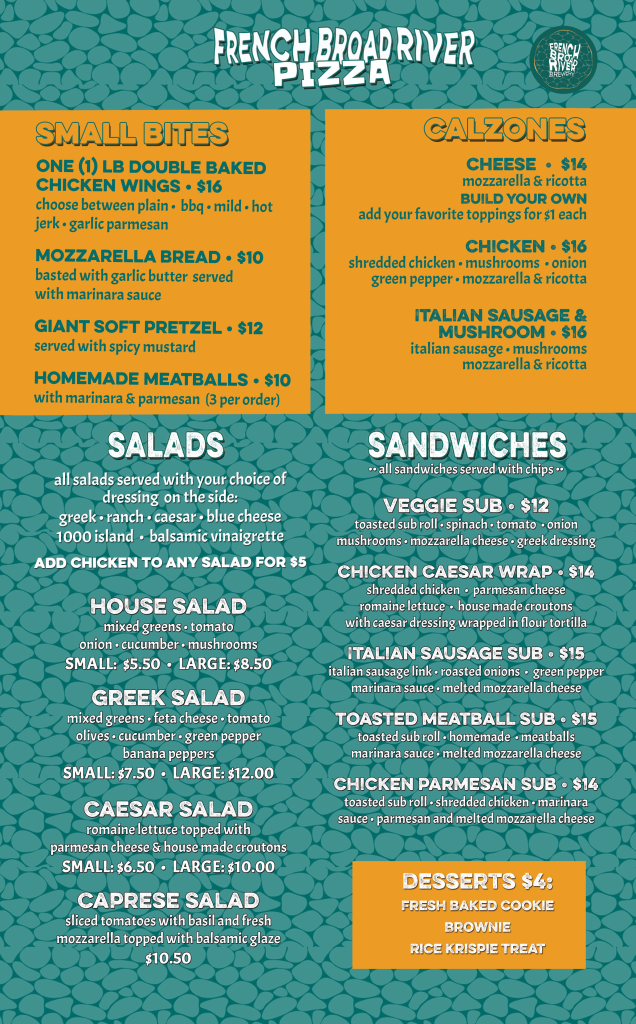 We can’t wait to see old friends and new faces alike. Order online for easy takeout or stop by the taproom to experience the magic of French Broad River Pizza in person.